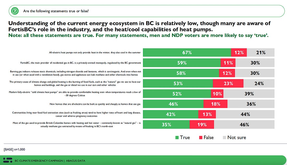 The BC Climate Emergency Campaign released a fascinating new poll this week (commissioned from Abacus Data). The poll assessed public concern about climate generally, public understanding of climate issues, and measured support for policies seeking to get gas out of buildings. While the poll was provincial, I suspect the trends mirror national views. The full results (including some nice visuals) are available here.