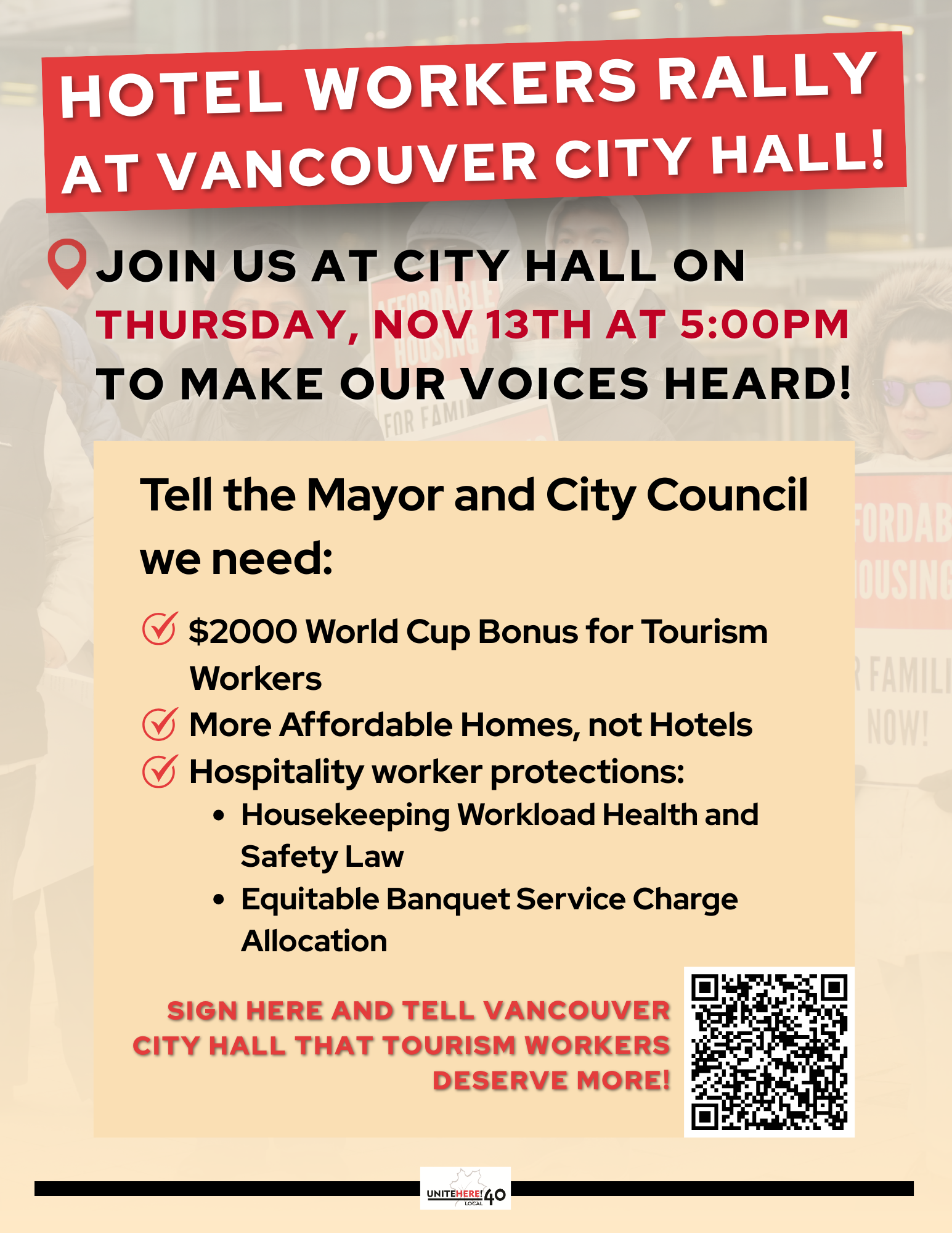 We invite you to join our rally on Thursday, November 13th at 5pm to tell City Hall: Make Vancouver affordable for tourism workers NOW!